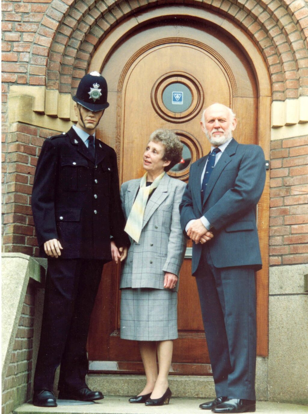 Ross Sims (1931-2021) met zijn vrouw in 1993 voor de entree van het Nederlands Politie Museum in Apeldoorn. Foto collectie Korpora.