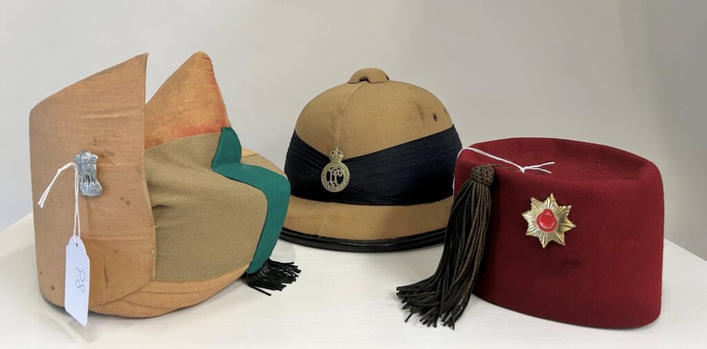 Van links naar rechts: Een vroeg naoorlogse turban van de Indiase politie, een tropenhelm van de Palestine Police Force (1920-1948) en een Fez van de Turkse politie 1916 gedateerd. Alle drie afkomstig uit de voormalige collectie van het Internationale Politiepettenmuseum te Slochteren. Foto: collectie Korpora.