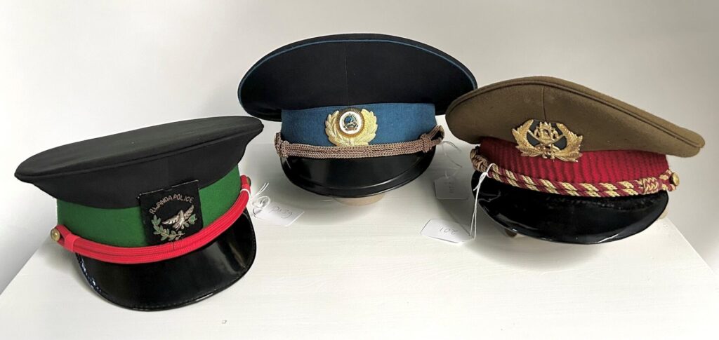 Van links naar rechts: Een platte pet van de Rwanda Police, Een platte pet van de Mongolian Police en een platte pet van de Afghaanse politie. Alle drie afkomstig uit de voormalige collectie van het Internationale Politiepettenmuseum te Slochteren. Foto: collectie Korpora.