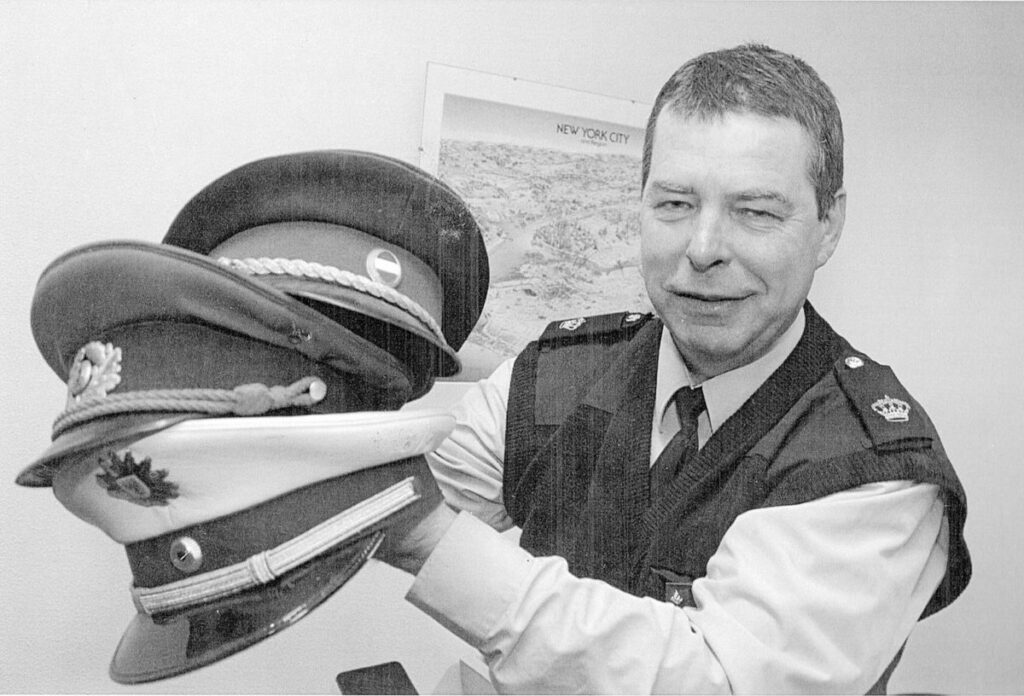 Hilbrand Buurma (1946-2018) met enkele buitenlandse politiepetten uit zijn collectie. Foto: Rieks Spijk EW Magazine.