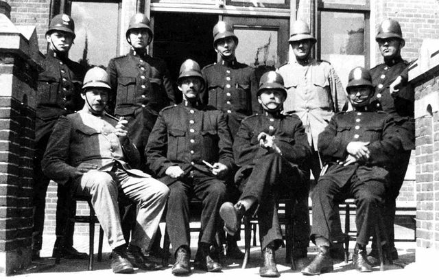 Het in juli 1914 ingevoerde 'Engelse model' uniform bij de Gemeentepolitie Den Haag. De agent is voorzien van de uniformjas met enkele rij knopen en Londense helm. Frima collectie inv.nr. B100-007