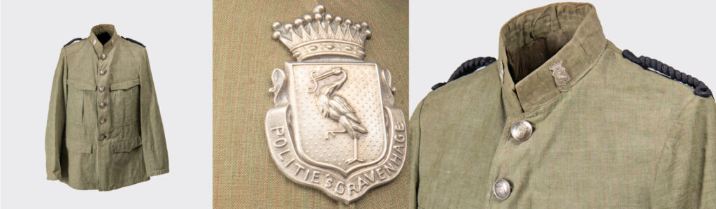 Het zomertenue van de Gemeentepolitie Den Haag in grijsgroene (KNIL) stof vervaardigd. Inv.nrs. K00540, K02043