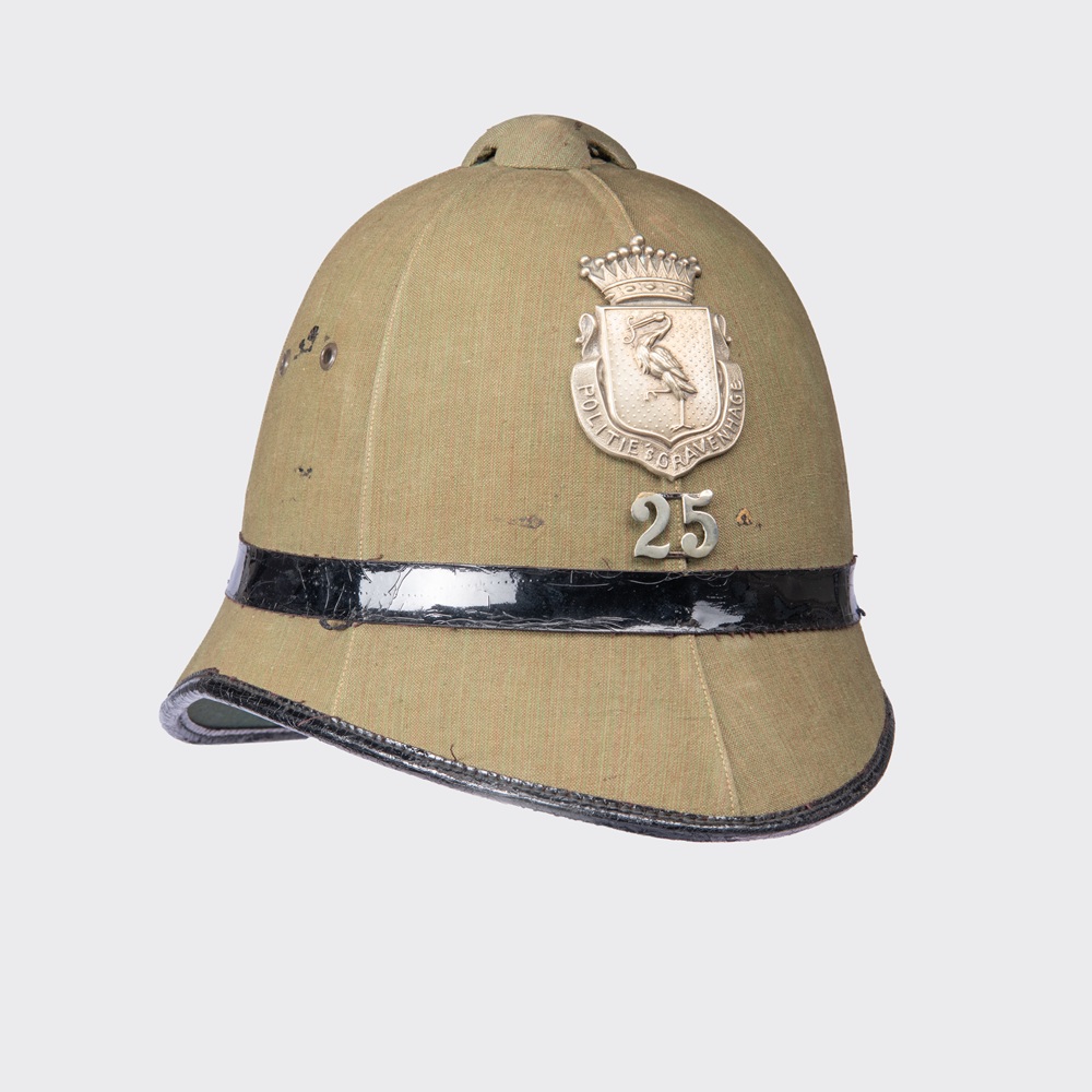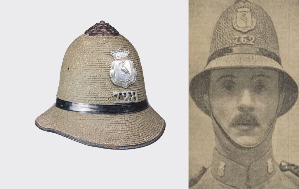 De in 1924 ingevoerde strohelm van de Gemeentepolitie Den Haag. Inv.nr. K00539 en Delpher.