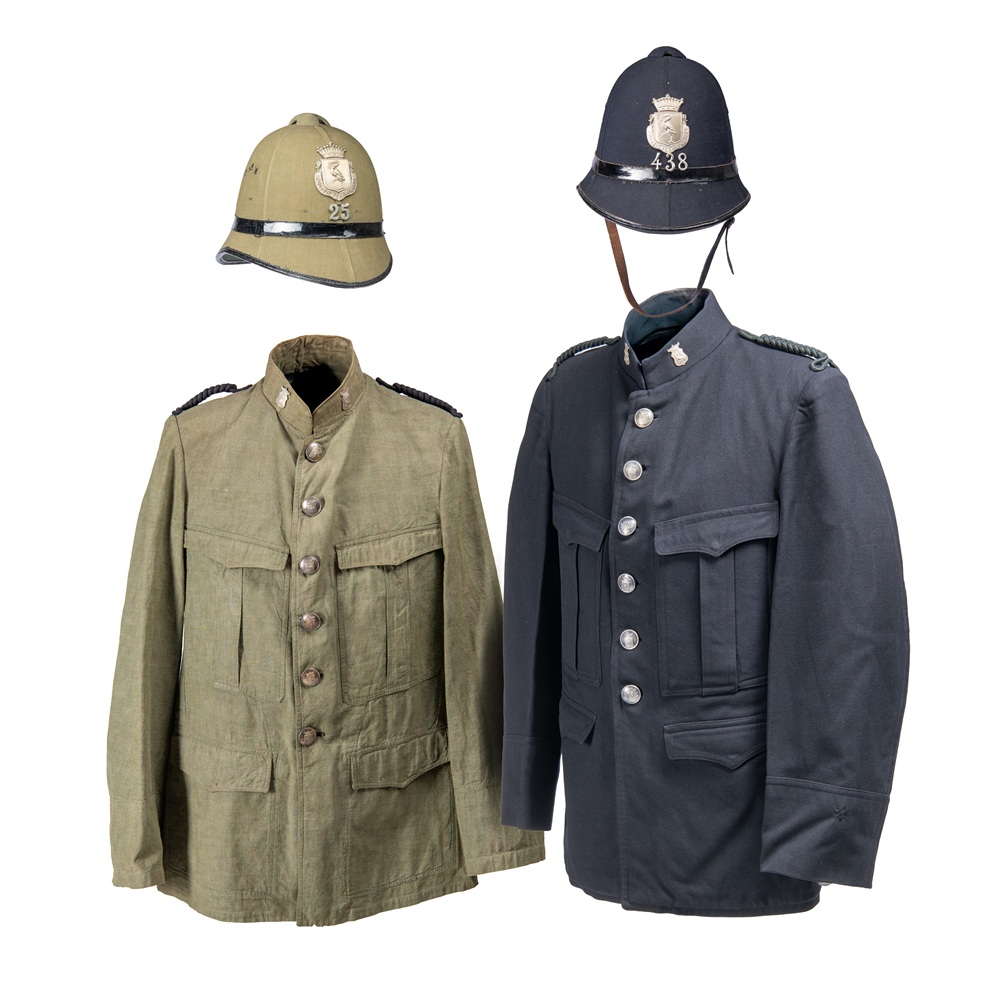 De in 1923 ingevoerde grijsgroene zomerjas naast de zomerjas met Londense helm uit 1930. De jas met helm uit 1930 was in een zwarte serge stof uitgevoerd. Inv.nrs. K02043, K00540, K02036 en K00109.c