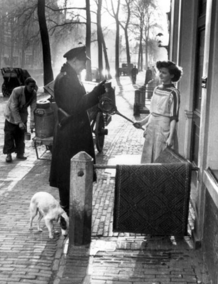 Een agent waarschuwt met opgeheven vinger een vrouw met een mattenklopper en een kleedje voor de ingang van een woning anno 1955. Fotograaf onbekend. Bron: Oud Amsterdam