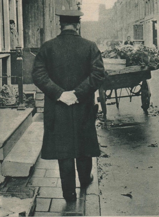 Een surveillerende politieagent. Illustratie in De stad Amsterdam. Geïllustreerd weekblad (1934). Een van de foto's die de kunstenaar Derksen inspireerde voor diens schilderij 'kleedjes kloppen'.