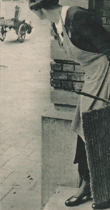 Een vrouw met een mat en een mattenklopper in haar hand in een portiek die kijkt of de kust vrij is om haar mat uit te kloppen. Illustratie in: De stad Amsterdam. Geïllustreerd weekblad (1934). Een van de foto's die de kunstenaar Derksen inspireerde voor diens schilderij 'kleedjes kloppen'.